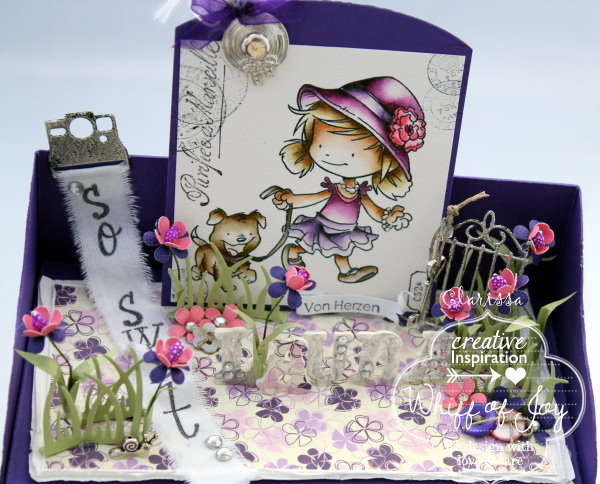 Mein Motiv ist die süsse Maya mit ihrem besten Freund, und auch die neuen französischen Vintage Poststempel haben mal wieder darauf Platz gefunden. Die Stanze ist ebenfalls aus der neuen Kollektion, ein Set von vier Fotoapparaten, hier lasse ich wieder ein selbst bestempeltes Band heraushängen. Die Standfüße der Kommode habe ich diesmal aus Wattekugeln gemacht, welche ich in silver shine embosst habe.